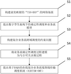 本发明提供了一种面向数字孪生的混合业务确定性传输调度方法。该方法包括:构建虚实映射的TSN+DIP的网络架构的网络场景,提出数字孪生架构下的确定性调度模型和业务流模型;将构建铁路运维场景中的混合业务流跨域问题转化为约束问题;将业务流端到端确定性调度过程建模为马尔可夫决策过程,提出基于决斗双深度Q网络D3QN的在线混合业务流端到端传输调度方法,得到最优的资源分配部署结果。本发明方法可以在铁路运维场景下,针对混合业务流端到端传输的情况,考虑不同业务流差异化需求,在保证业务流被成功调度的条件下,实现较低的端到端整体时延和较高的传输收益。CN119012237A