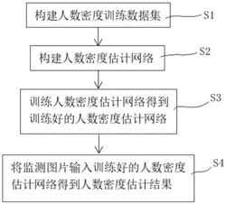 本发明公开了一种拥挤场景下的人数估计方法及电子设备,包括如下步骤:S1、构建人数密度训练数据集;S2、构建人数密度估计网络;S3、得到训练好的人数密度估计网络;S4、将监测图片输入训练好的人数密度估计网络得到人数密度估计结果。本发明采用深度学习的方法,可以很好的区分前景和背景,尤其在画面中存在人像海报时,本发明所述方法可以避免误检,实现了在客户给定感兴趣区域中,快速、准确获取乘客人数信息及位置信息,通过安全人员及时调节,避免感兴趣区域中乘客人数超出阈值,从而带来的安全隐患。