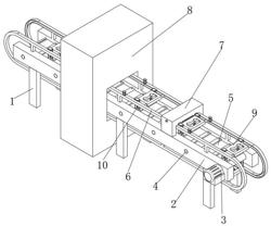 本发明涉及刹车片检测技术领域,具体地说是一种刹车片生产用凸点检测装置,包括六个支腿,且三个支腿为一组,每组支腿的顶部均安装有轨板,其中一个轨板的一侧安装有电机,两个轨板的内侧安装有七个转轴,七个转轴的外侧装套有传动带,传动带的外侧安装有链接板,两个轨板的外侧安装有荧光检测机,夹具,设置于翻转组件远离传动带的一侧,其被装配为对刹车片进行夹持,且通过与翻转组件和制动组件配合能够实现翻转,制动组件,设置于两个导轨外侧,且制动组件有两个其被装配为对夹具进行制动,翻转组件,设置于链接板远离传动带的一侧,其被装配为为夹具提供支撑的同时为夹具翻转提供条件,本发明能够实现刹车片的双面检测,增强了检测效果。G01N