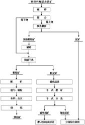 本发明涉及难选铁矿选冶技术领域,公开了一种熔剂性鲕状赤铁矿全干法利用方法,包括:将熔剂性鲕状赤铁矿破碎得到粉碎物料,将粉碎物料筛分得到筛上物和筛下物,对筛上物预选抛废得到预选粗精矿和尾矿;将预选粗精矿破碎得到破碎物料,将破碎物料和筛下物混合得到混合料,对混合料强磁干选得到粗精矿和粗尾矿;将粗精矿与烧结原料混合得到混合物料,将混合物料制粒得到烧结混合料,将烧结混合料布料、点火和烧结;将粗尾矿磁化焙烧得到焙烧矿,将焙烧矿磨矿得到细磨精矿,将细磨精矿分选得到磁铁精矿和细粒尾矿。本发明对熔剂性鲕状赤铁矿进行加工处理,实现熔剂性鲕状赤铁矿的产业化应用,对实现矿产资源的综合利用具有重要的现实意义。B03